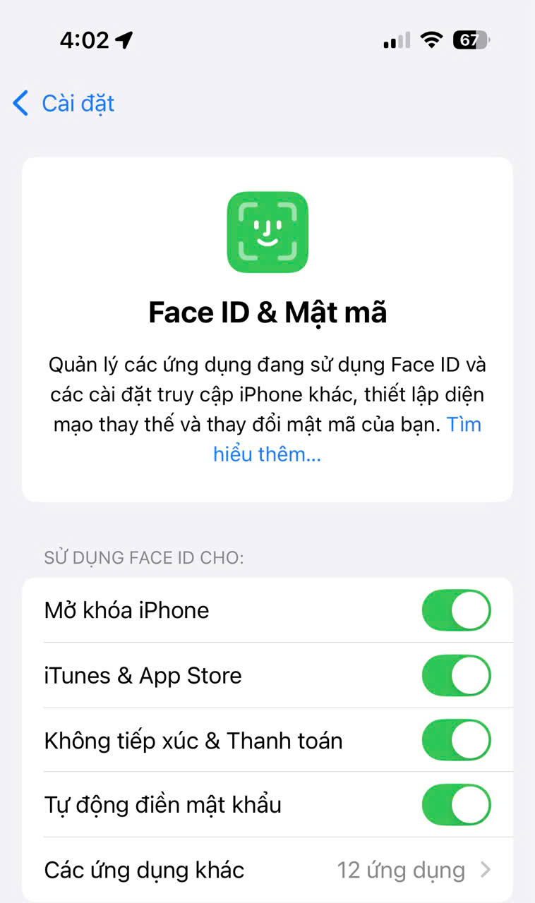Kiểm tra cài đặt Face ID bằng cách vào Cài đặt > Face ID & Mật mã, đảm bảo Face ID được bật cho các tác vụ như mở khóa máy, xác minh App Store, v.v.