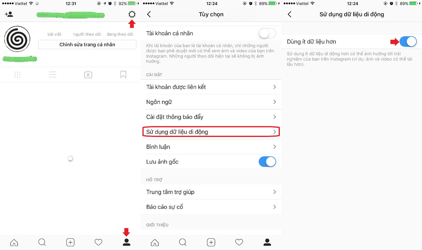Bấm vào tab hình 3 gạch ở góc dưới bên phải màn hình, sau đó cuộn màn hình xuống dưới cùng và chọn Cài đặt → Cài đặt tài khoản. Ở màn hình tiếp theo chúng ta chọn Video và ảnh và có thể tắt hết các tùy chọn Tải lên HD. Ở tùy chọn Tự động phát, bấm vào và chọn Không bao giờ tự động phát video.